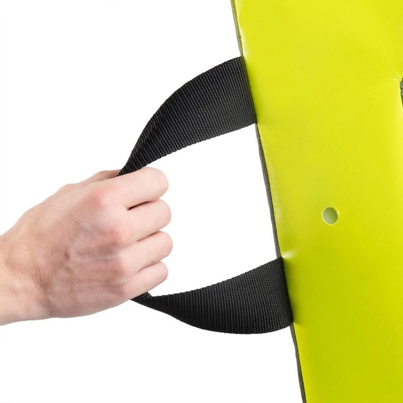 Le bouclier de percussion possĂšde 2 anses sur la face arriĂšre et un renfort sur le haut de la face avant. Pour plus de confort, nous avons choisi une bande scratch plutĂŽt qu’une fermeture Eclair.